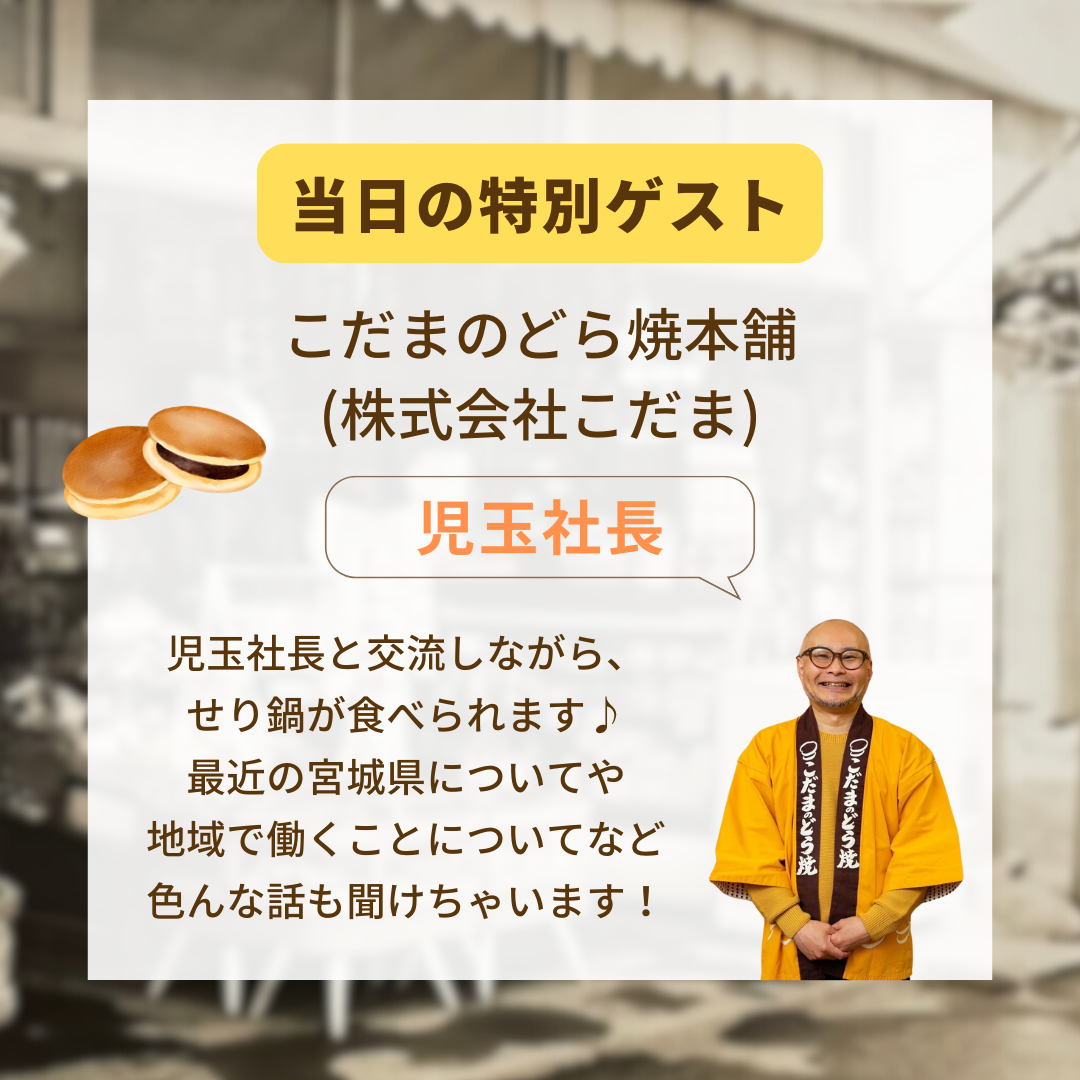 仙台名物の「せり鍋」作りを体験をしながら、仙台の老舗和菓子屋『こだまのどら焼本舗(株式会社こだま)』の児玉社長と交流することができます。